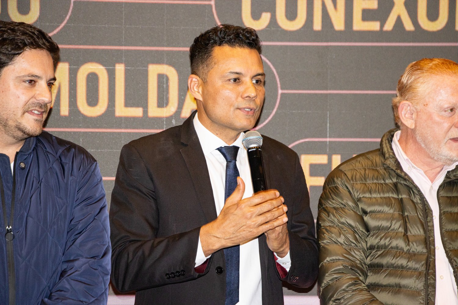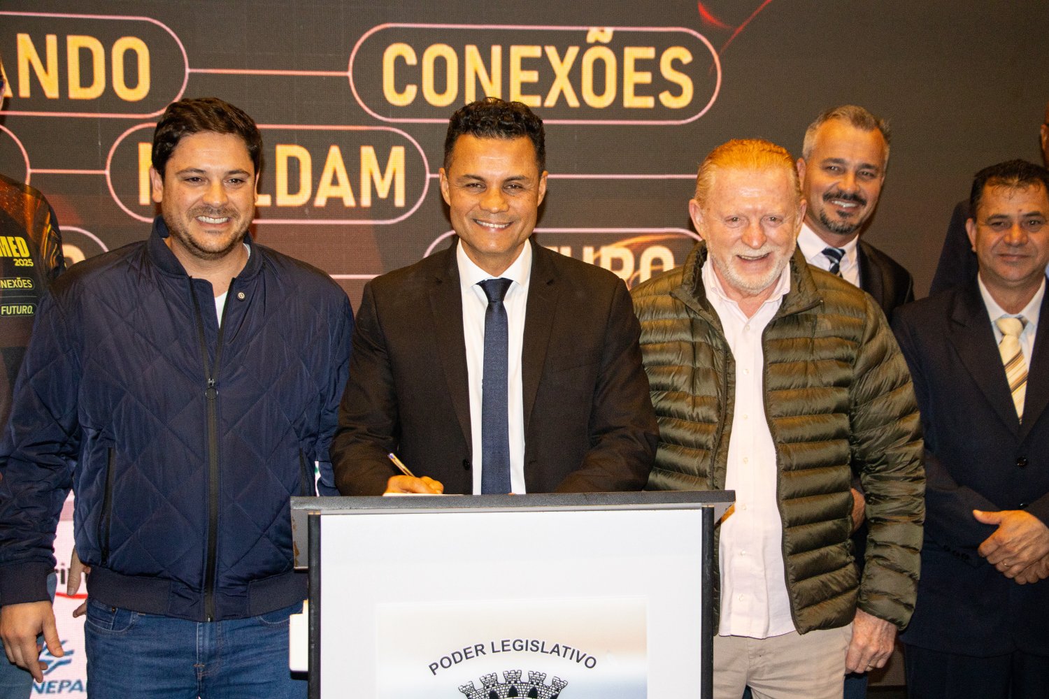 O ato aconteceu na quinta-feira (09) no palco do pavilhão principal e contou a presença do prefeito Antonio França, o vice Evandro Mees, o Deputado Estadual Matheus Vermelho, que destinou a emenda para o município, o Deputado Federal Vermelho, vereadores, secretários municipais, autoridades empresariais e visitantes da feira.