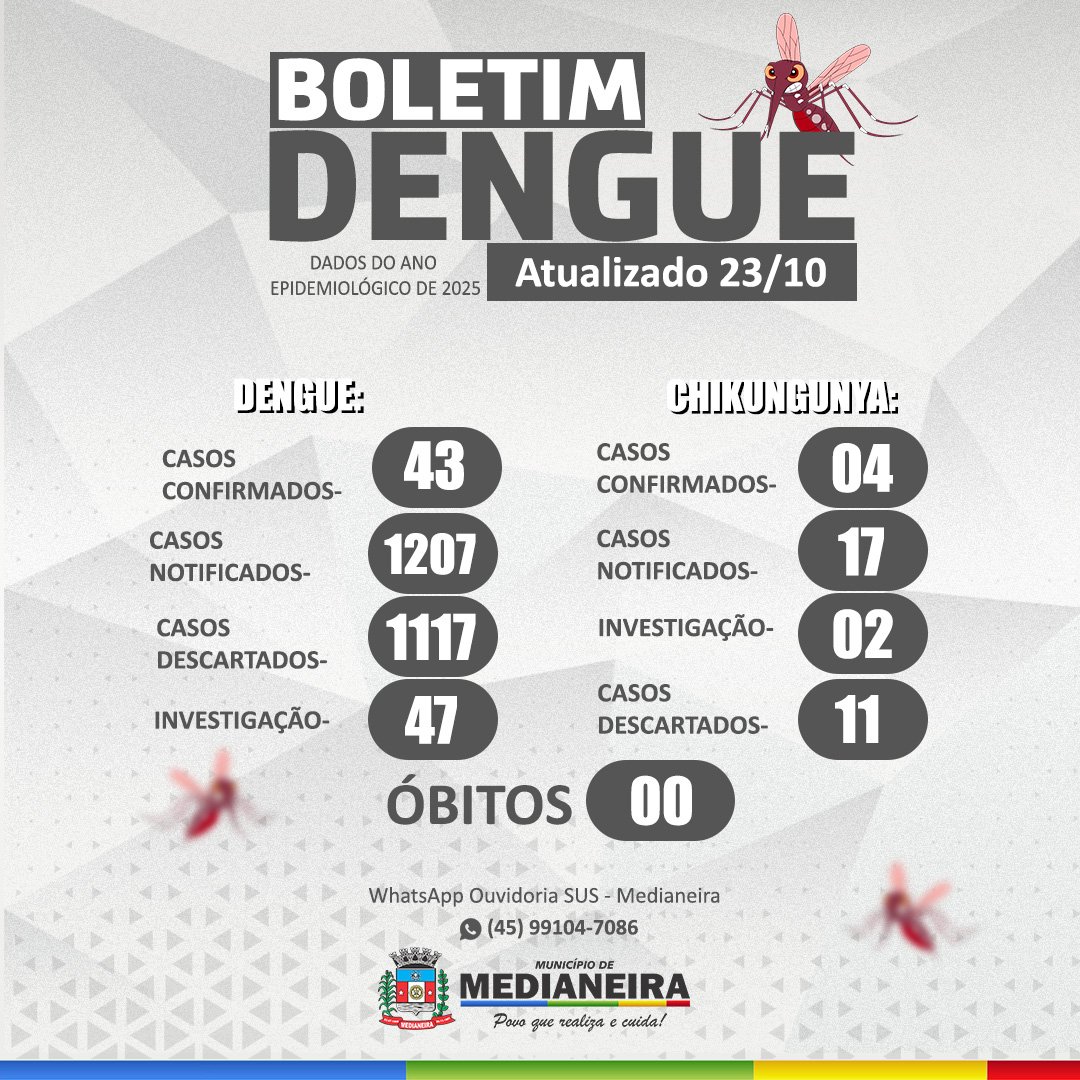 DENGUE: O município registrou até o momento 1207 notificações, 43 foram confirmadas, sendo 02 com sinais de alarme, 1117 foram descartados e 47 estão em investigação.