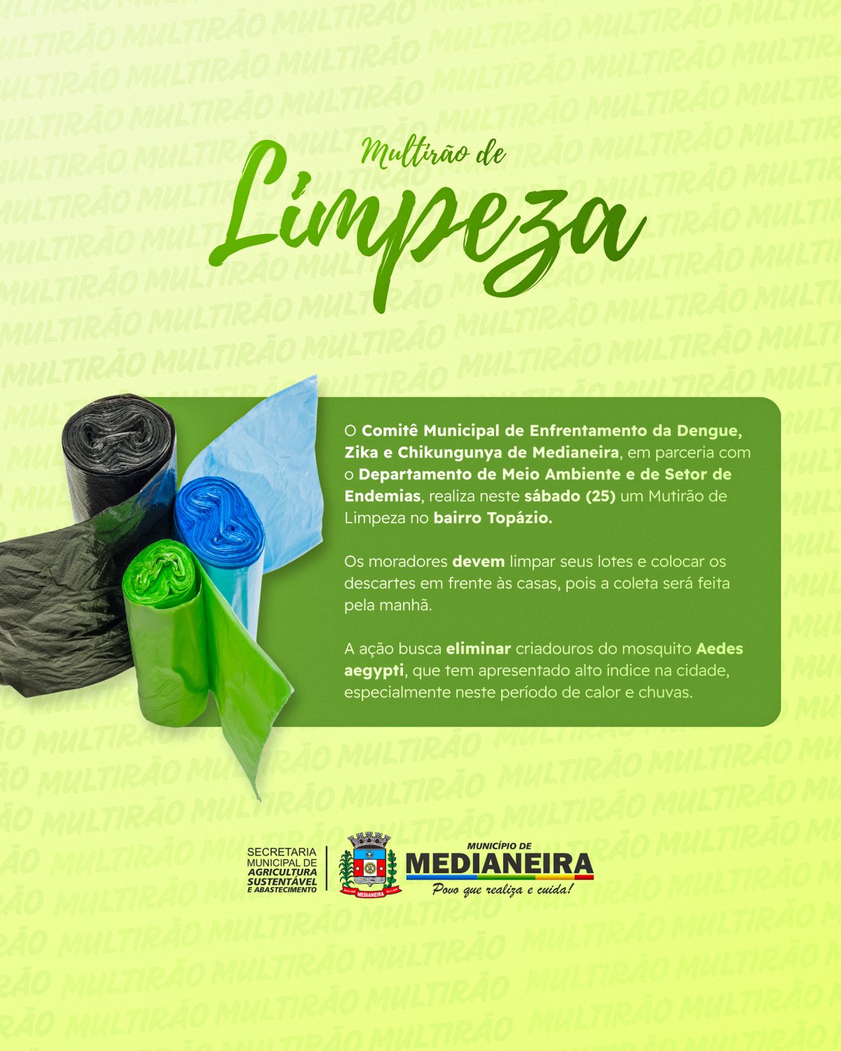 O Comitê Municipal de Enfrentamento da Dengue, Zika e Chikungunya de Medianeira, em parceria com o departamento de Meio Ambiente e o Setor de Endemias, irá realizar neste sábado (25) um Mutirão de Limpeza no bairro Topázio.