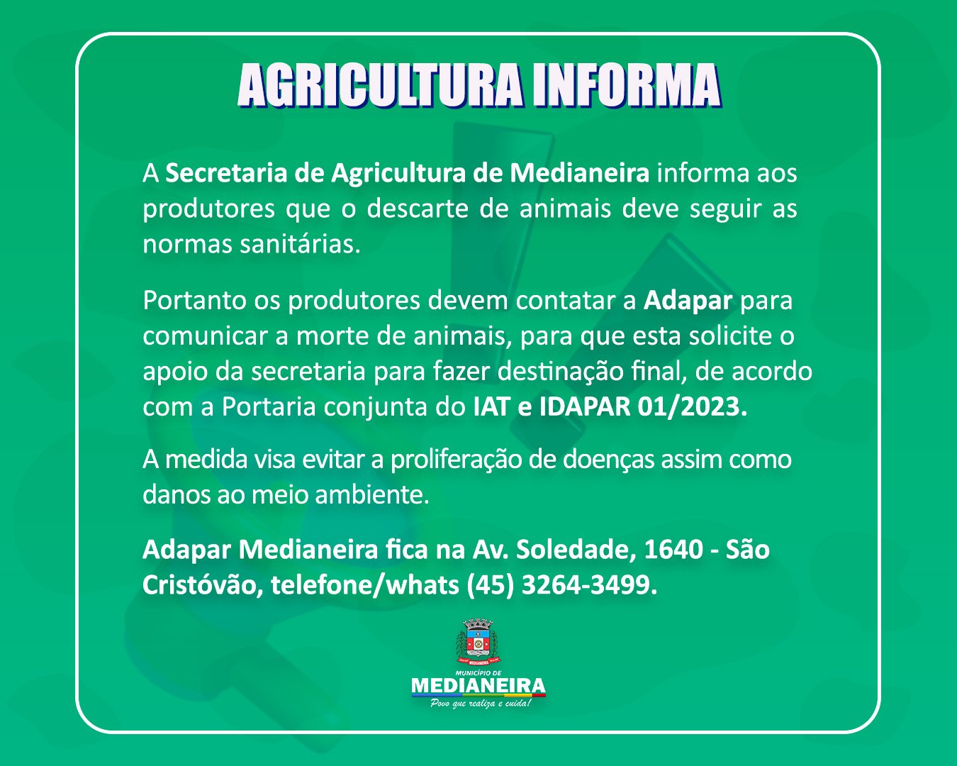 A Secretaria de Agricultura de Medianeira informa aos produtores que o descarte de animais deve seguir as normas sanitárias. Portanto os produtores devem contatar a Adapar para comunicar a morte de animais, para que esta solicite o apoio da secretaria para fazer destinação final, de acordo com a Portaria conjunta do IAT e IDAPAR 01/2023.