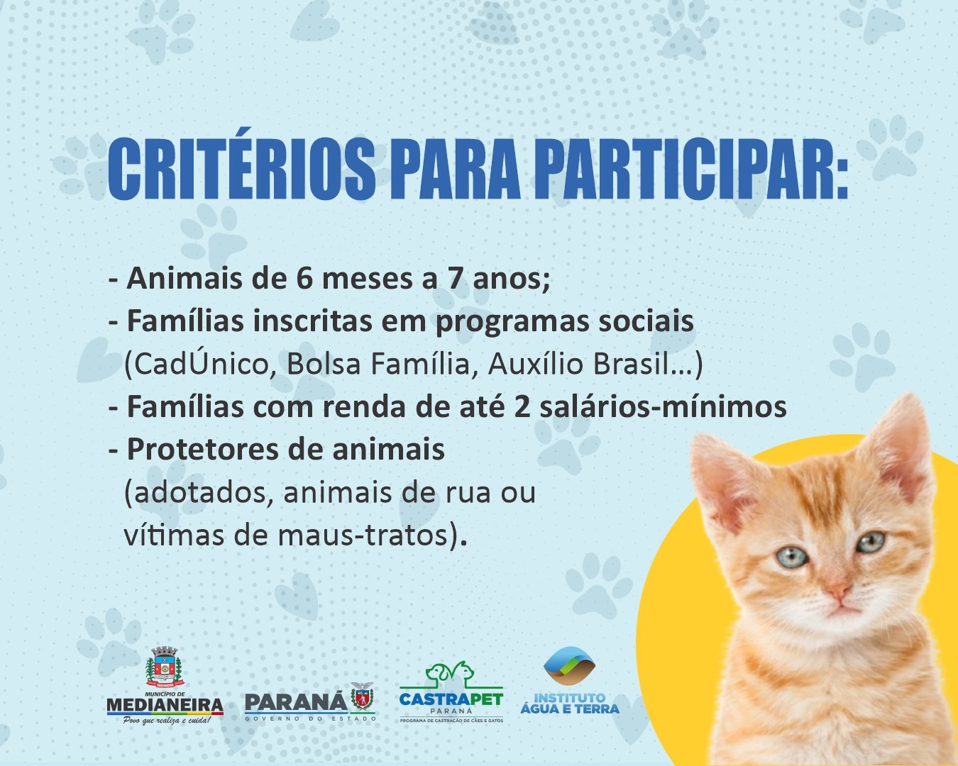 Podem participar famílias inscritas em programas sociais (como CadÚnico, Bolsa Família e Auxílio Brasil), famílias com renda de até dois salários-mínimos, além de protetores de animais. Os pets devem ter entre 6 meses e 7 anos e estar saudáveis no momento da inscrição.