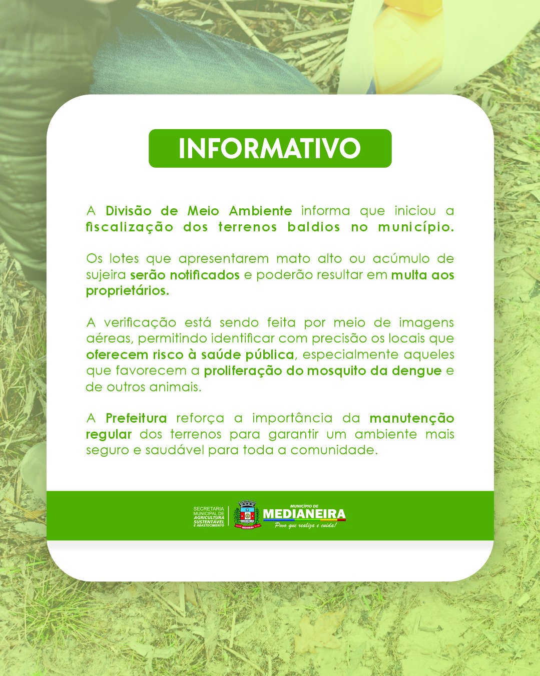 A Divisão de Meio Ambiente informa que iniciou a fiscalização dos terrenos baldios no município
