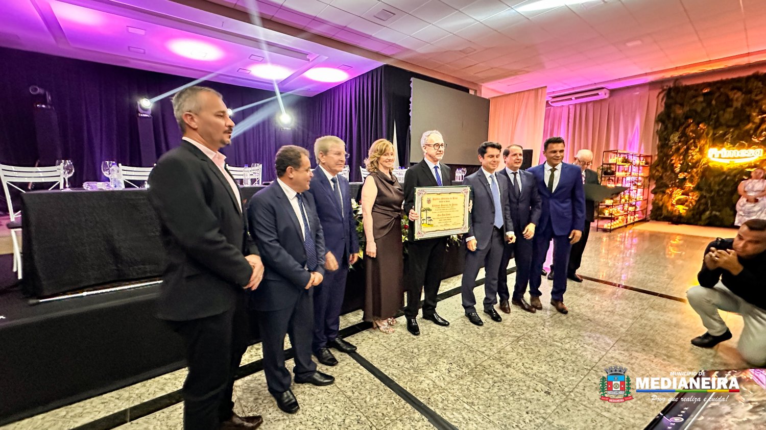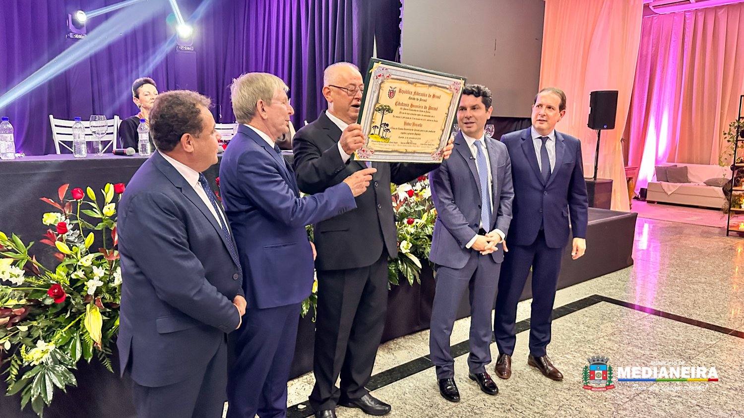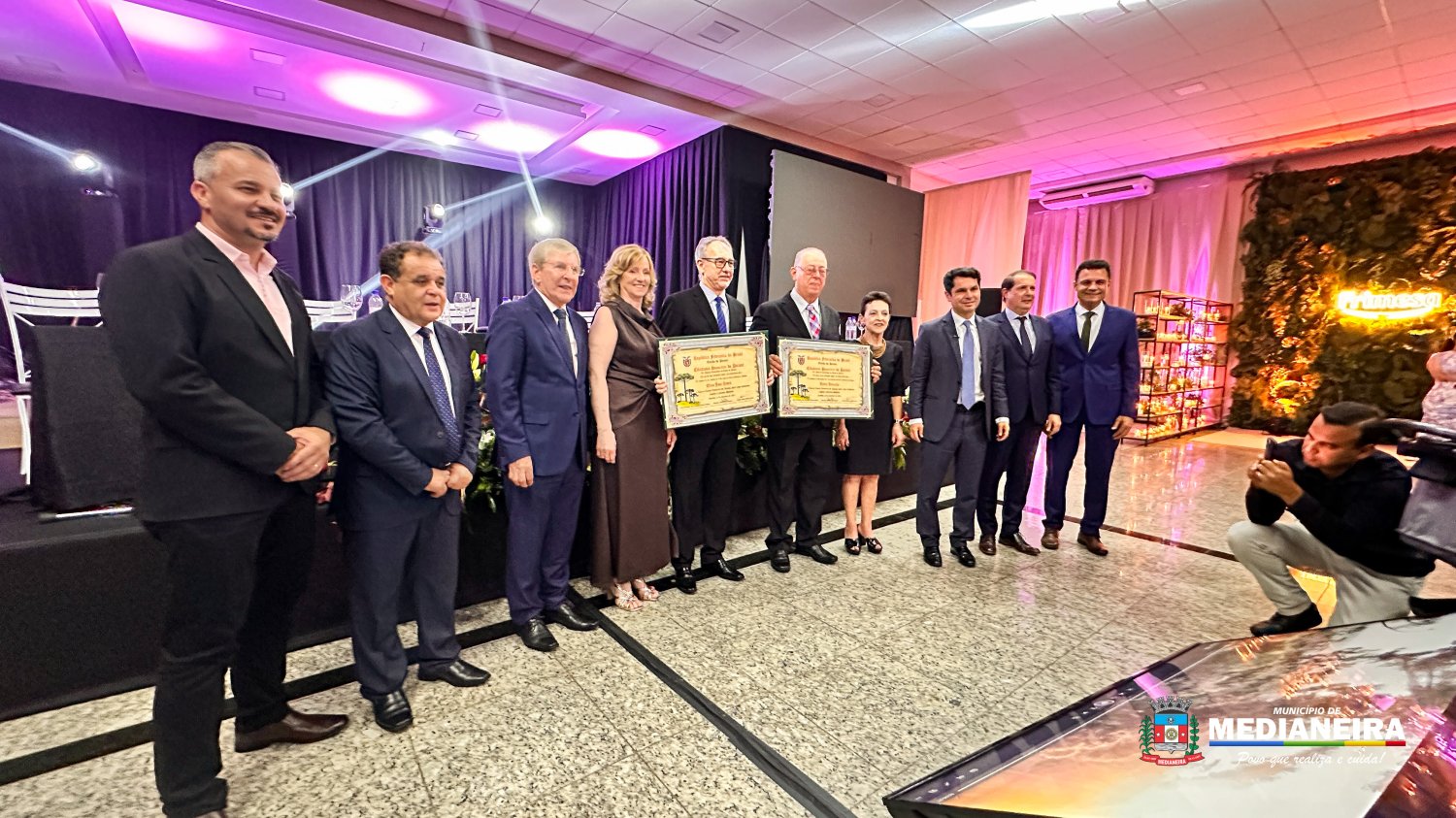O prefeito Antonio França e o vice-prefeito Evandro Mees participaram na noite da última sexta-feira (05), da cerimônia de entrega do título de Cidadão Honorário do Paraná ao ex-presidente Valter Vanzella e diretor-presidente da Frimesa Elias Zydek.