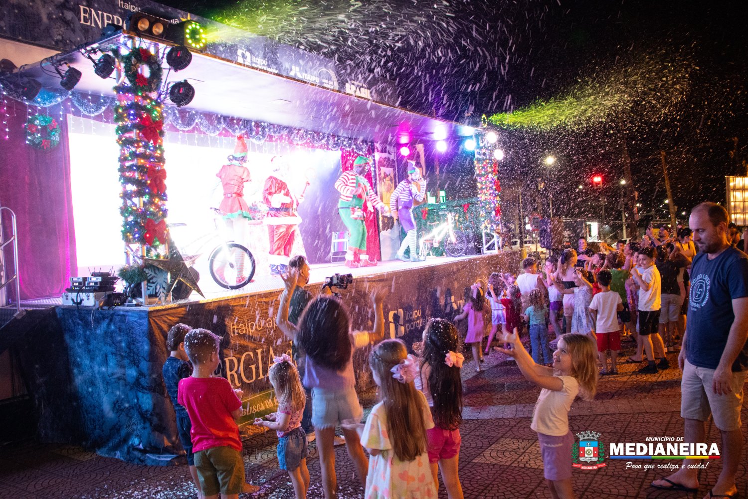 Dentro da programação do Feliz Natal Medianeira, a magia tomou conta da cidade na noite desta quinta-feira (11) com o espetáculo Energia de Natal – Em Busca da Estrela de Natal, promovido pela Itaipu Binacional e Itaipu Parquetec.