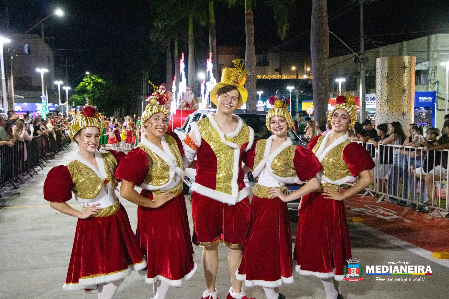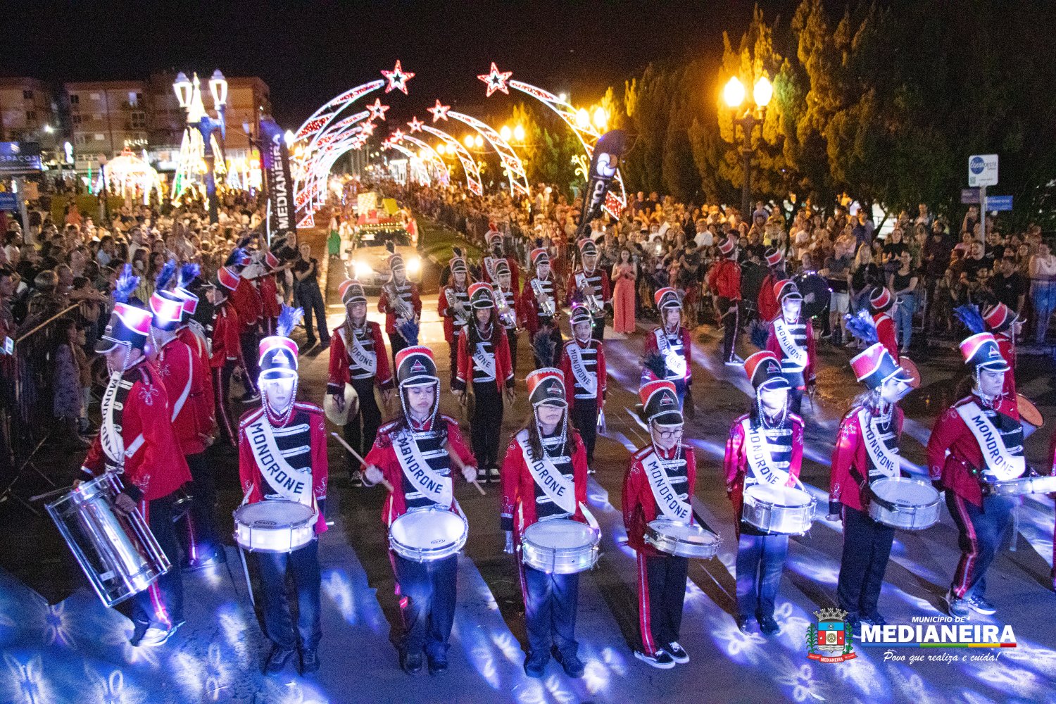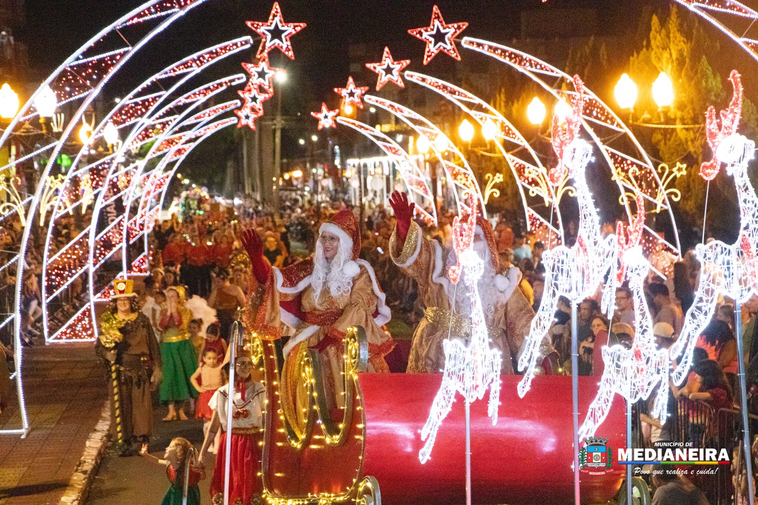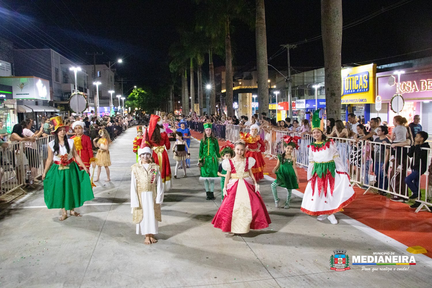 A abertura do desfile ficou por conta do Papai Noel e da Mamãe Noel do Departamento de Cultura de Medianeira, acompanhados por personagens como presentes, bonecos, fadas, duendes, bailarinas, além de Maria e José, em referência ao nascimento do Menino Jesus. A Fanfarra do Mondrone marcou o início das apresentações, dando ritmo e energia à noite.
