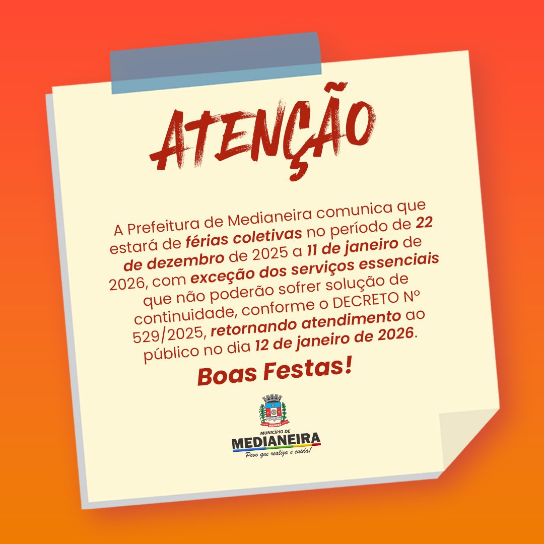 A Prefeitura de Medianeira comunica que estará de férias coletivas no período de 22 de dezembro de 2025 a 11 de janeiro de 2026, com exceção dos serviços essenciais que não poderão sofrer solução de continuidade, conforme o DECRETO Nº 529/2025, retornando atendimento ao público no dia 12 de janeiro de 2026.