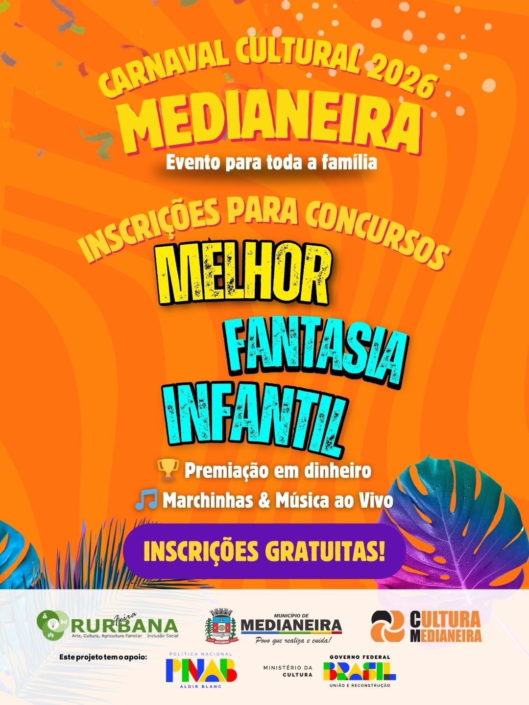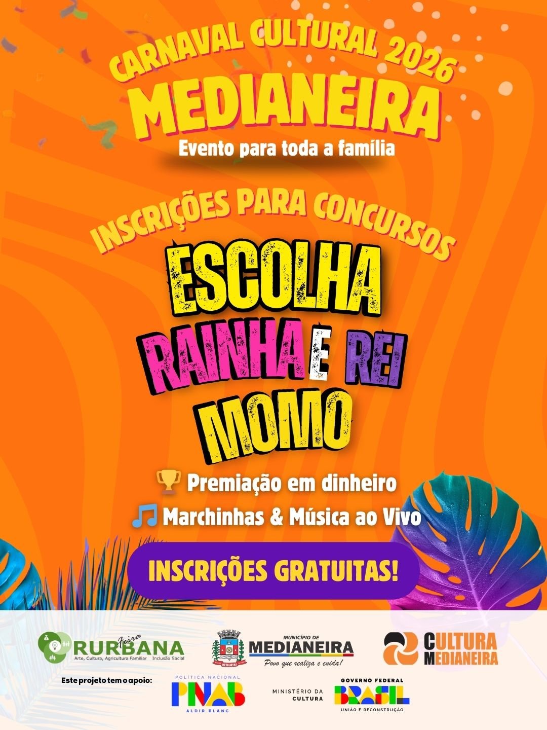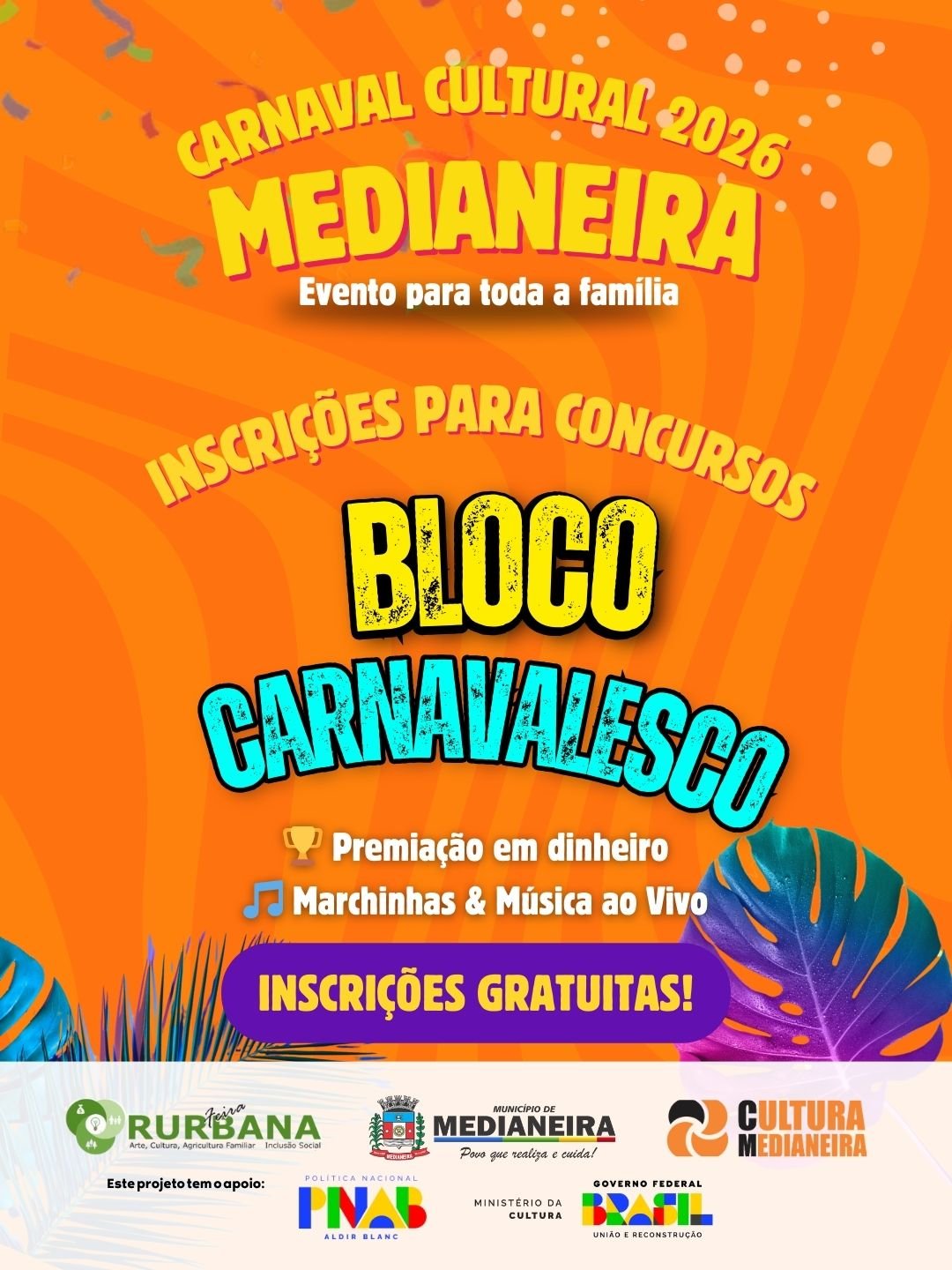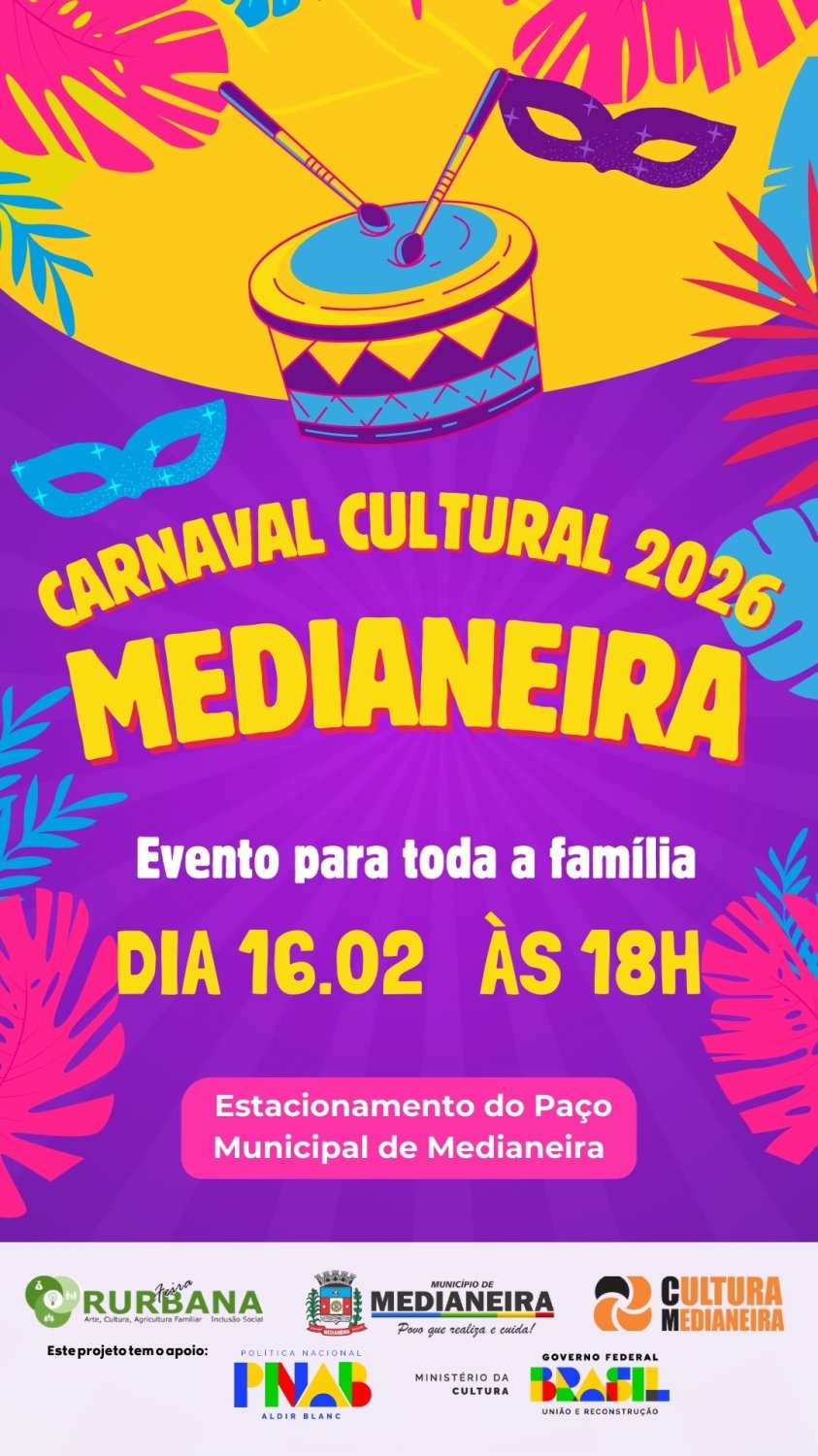 A Prefeitura de Medianeira promove, no dia 16 de fevereiro, a partir das 18 horas, o Carnaval Cultural, no estacionamento da Prefeitura; O evento é aberto ao público e foi preparado para proporcionar uma noite de alegria, música e integração para toda a comunidade.