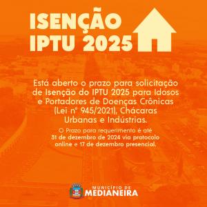 Está aberto o prazo para solicitação de isenção do IPTU 2025 para Idosos e portadores de Doenças Crônicas (conforme a Lei nº 945/2021), Chácaras Urbanas e Indústrias.