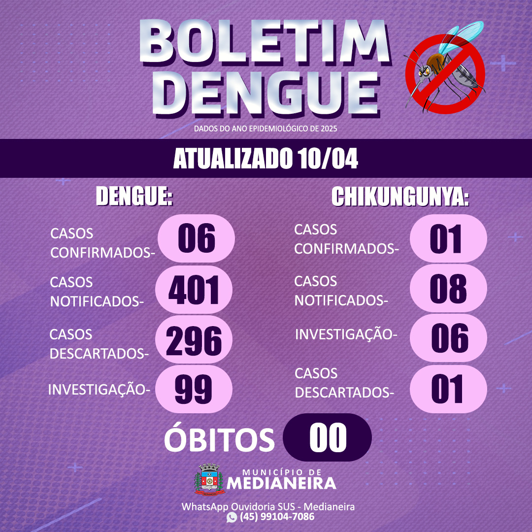 DENGUE: O município registrou até o momento 401 notificações, 06 foram confirmadas, sendo 02 com sinais de alarme, 296 foram descartados e 99 estão em investigação.