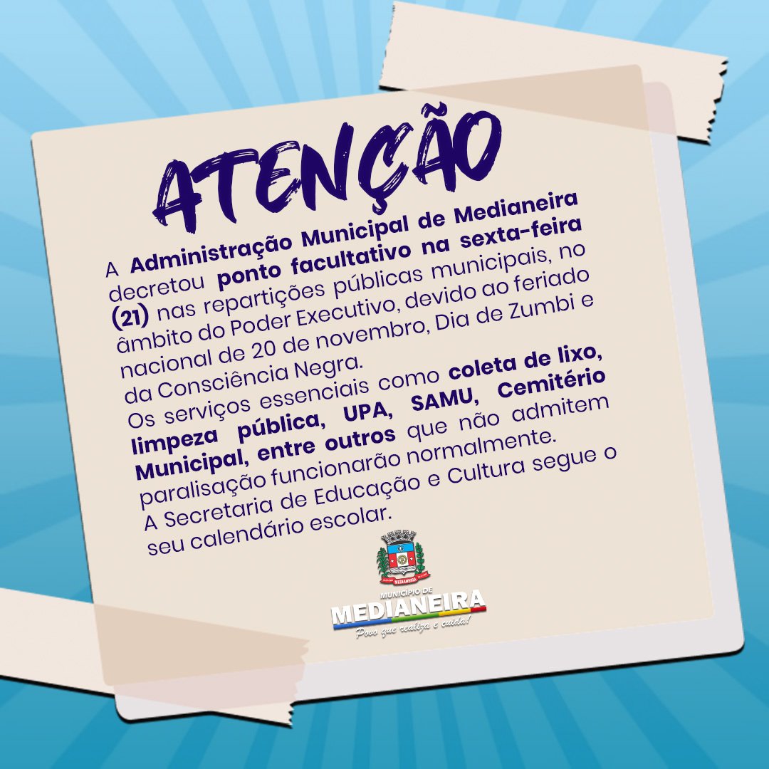 A Administração Municipal de Medianeira decretou ponto facultativo na sexta-feira (21) nas repartições públicas municipais, no âmbito do Poder Executivo, devido ao feriado nacional de 20 de novembro, Dia de Zumbi e da Consciência Negra.
