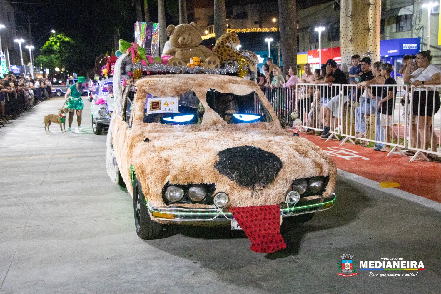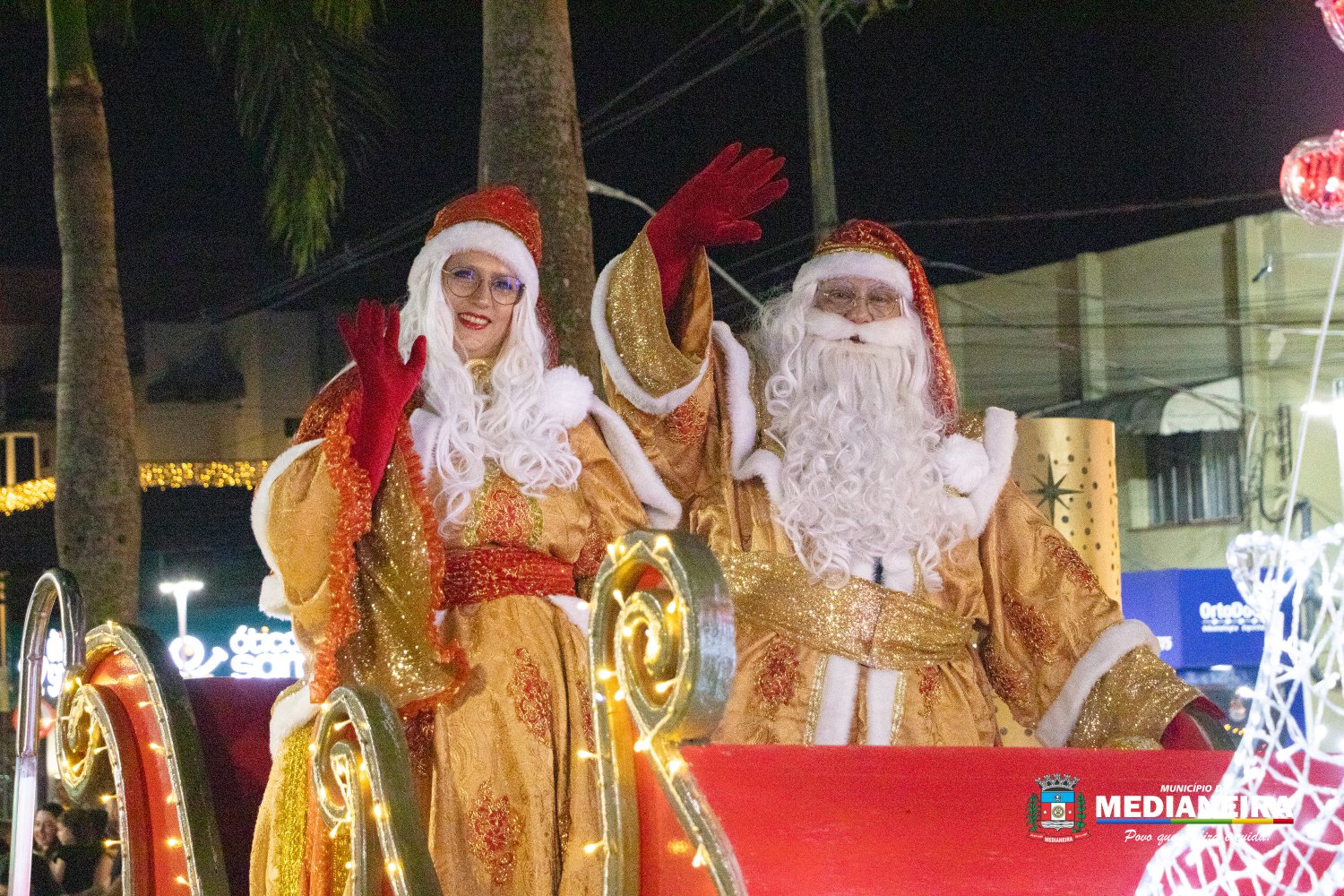 A abertura do desfile ficou por conta do Papai Noel e da Mamãe Noel do Departamento de Cultura de Medianeira, acompanhados por personagens como presentes, bonecos, fadas, duendes, bailarinas, além de Maria e José, em referência ao nascimento do Menino Jesus. A Fanfarra do Mondrone marcou o início das apresentações, dando ritmo e energia à noite.