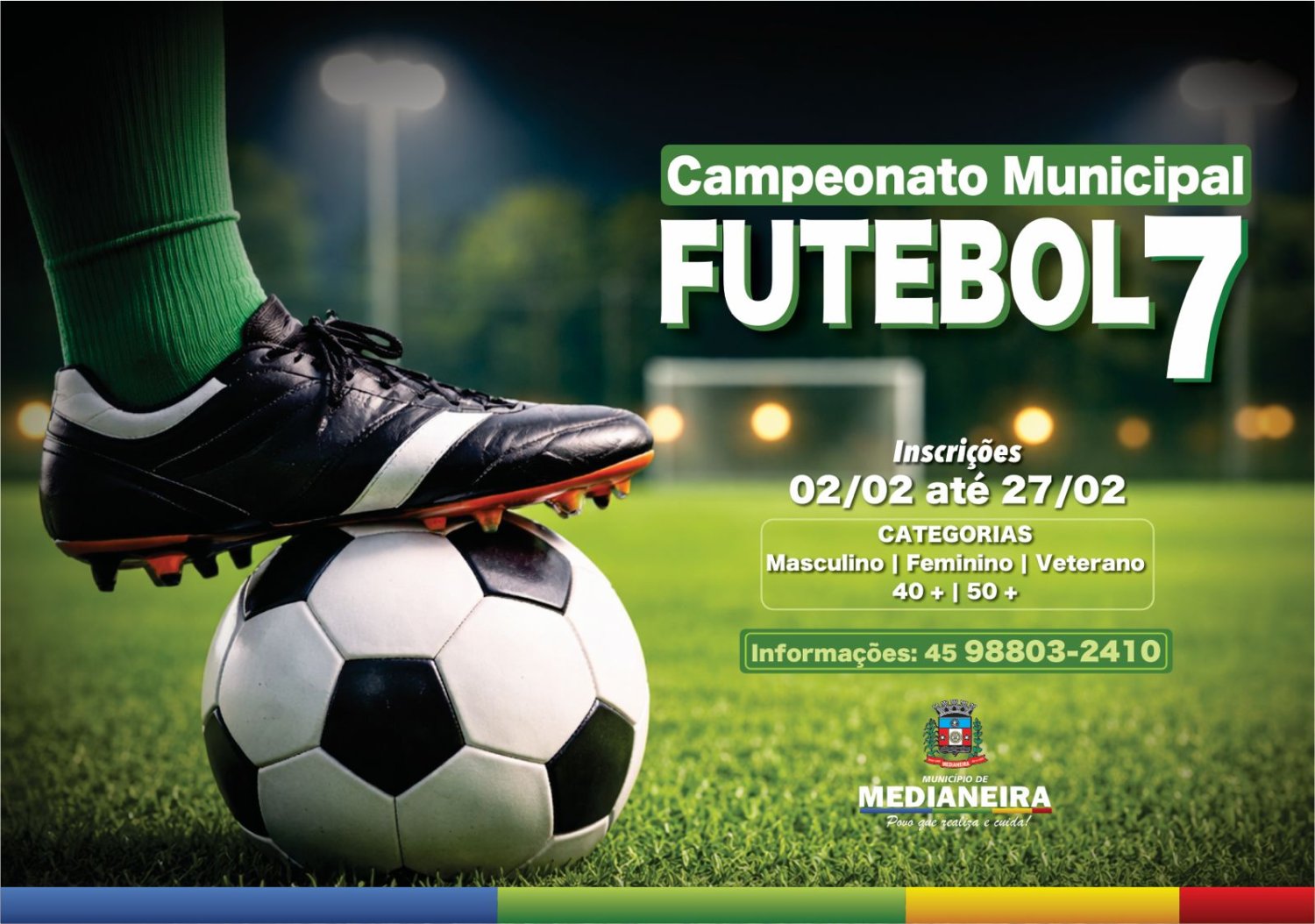 A Secretaria de Esportes informa que estão abertas as inscrições para o Campeonato Municipal de Futebol Sete 2026, nas categorias Feminino, Masculino e Veterano. As equipes interessadas podem se inscrever até o dia 27 de fevereiro.